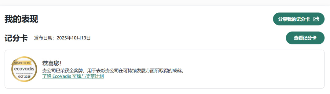 ● 金牌(Gold Medal): 授予总分位列前5% 的企业(且分数需达到78分及以上)。这意味着公司的可持续发展绩效已位列全球参评企业的前5%。